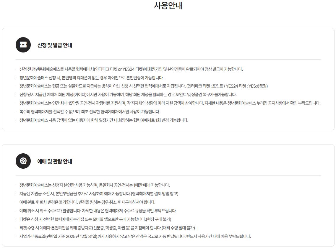 본인 사용 원칙: 청년문화예술패스는 신청자 본인만 사용 가능하며, 동일 회차의 공연·전시는 1매만 예매 가능합니다.